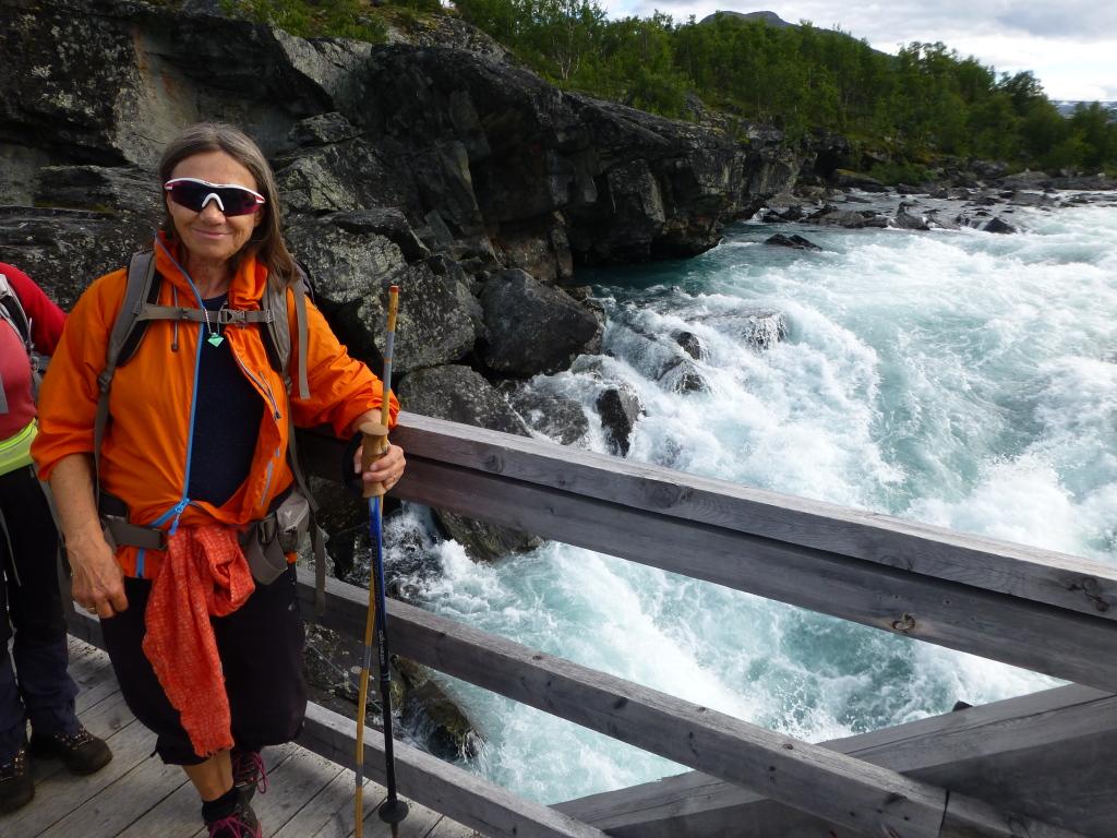 Nede igjen ved skumhvite Sjoa: Ingalill på gangbrua over elva.