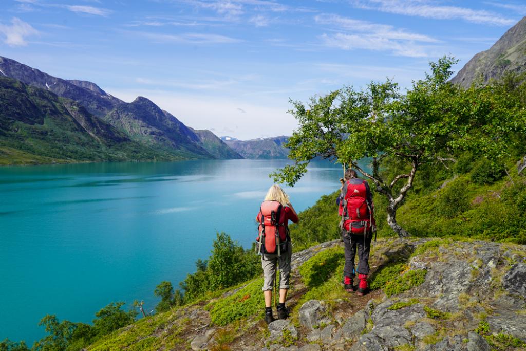 På vei mot Memurubu/Gjendebu: Tiril og Ingalill skuer innover det blågrønne Gjendevatnet.