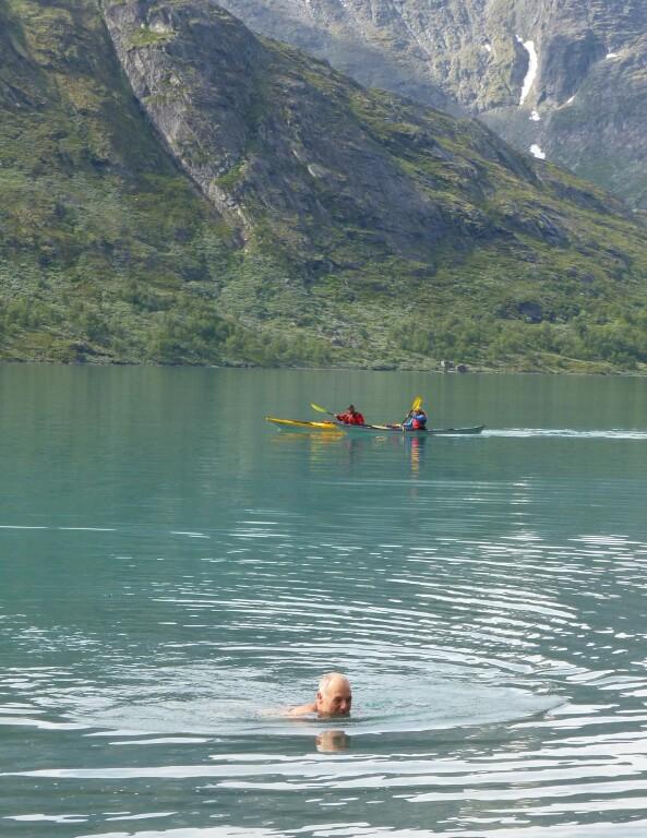 Bjarte svømmer i iskalde Gjende før matpause. Kajakkpadlere i bakgrunnen.