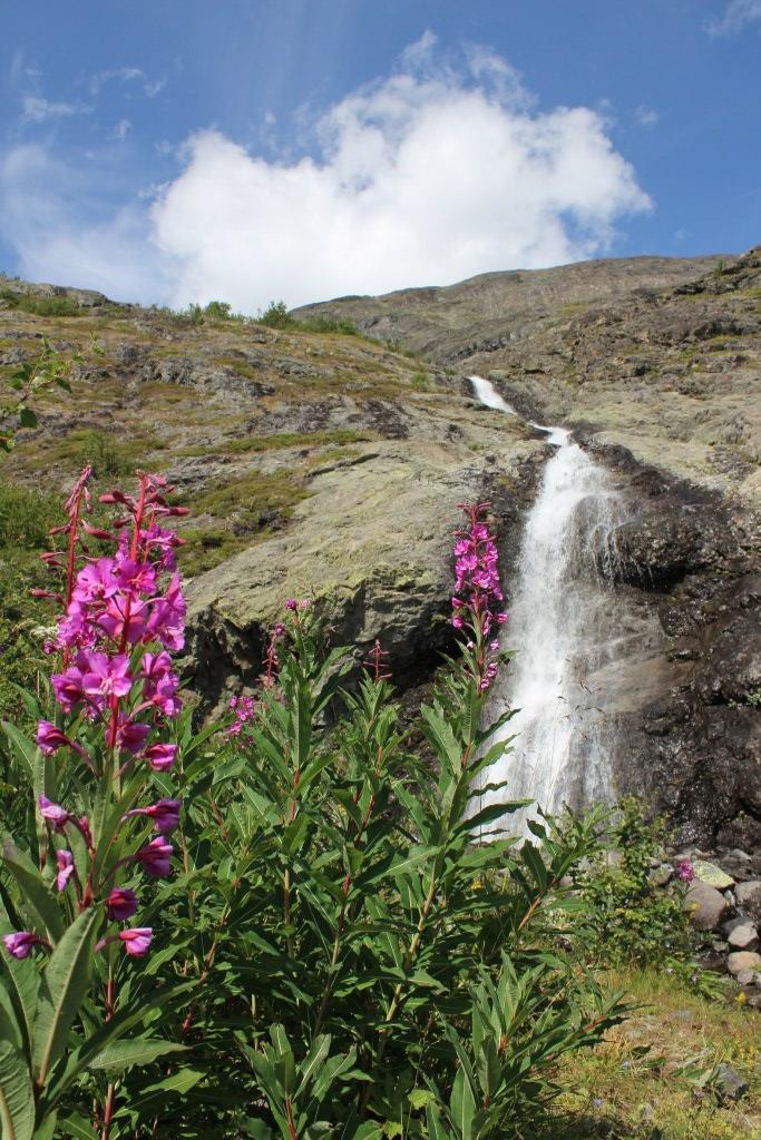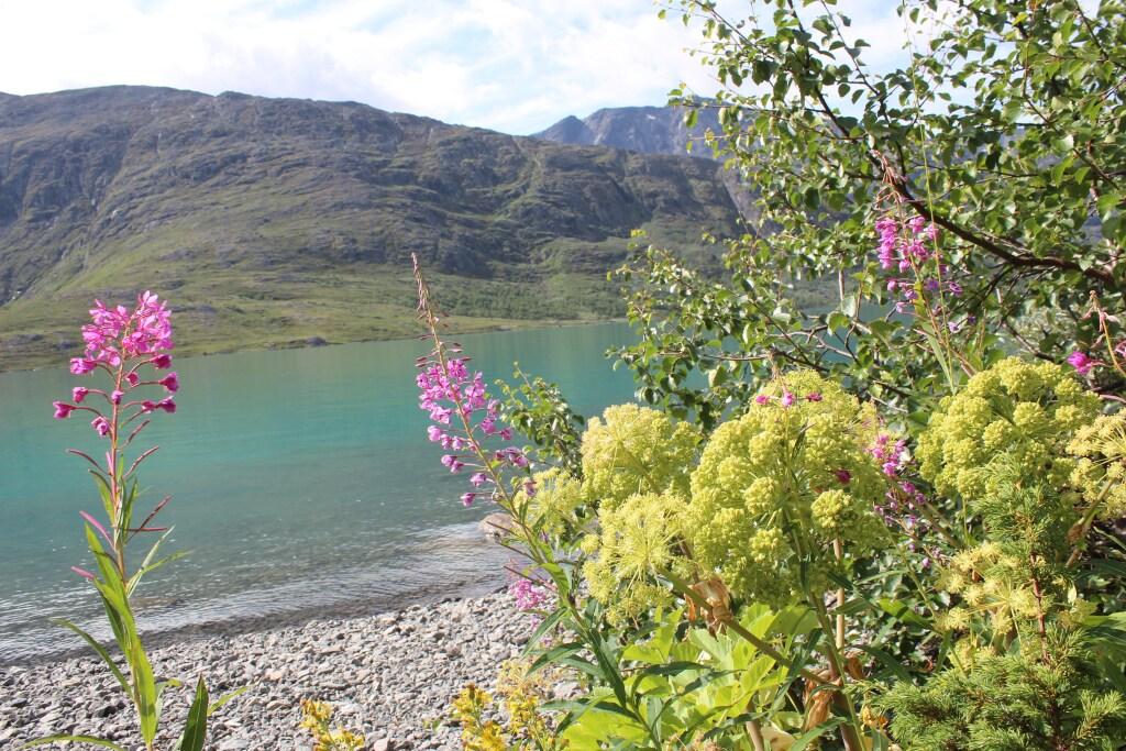Vakkert langs Gjende 1: Blomstene geitrams (Chamaenerion angustifolium) og kvann (Angelica archangelica) i forgrunnen.
