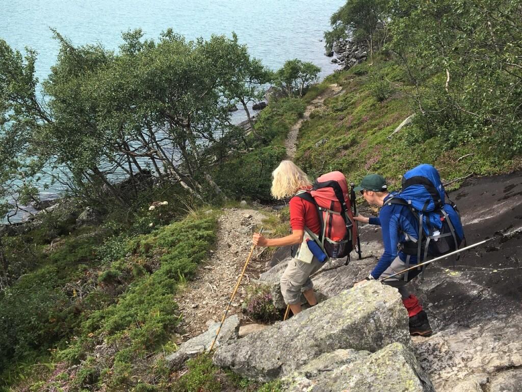 Kupert langs Gjende: Tiril og Lars ned ei bratte.