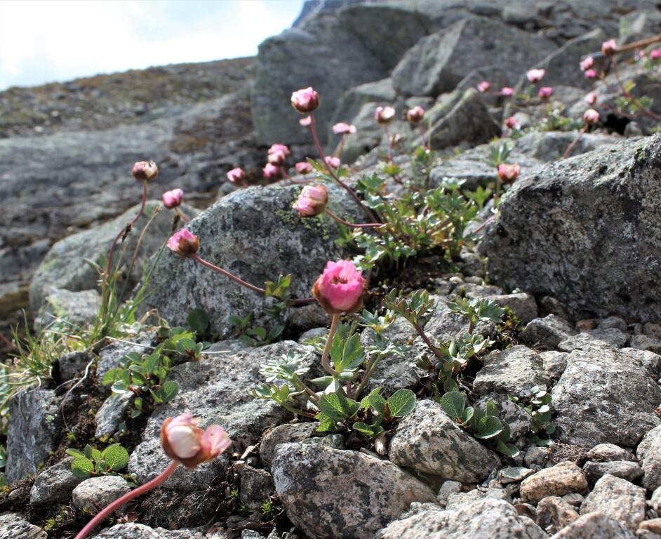 Lavt: Den hvitrosa blomsten issoleie (Ranunculus glacialis) pynter opp langs stien.