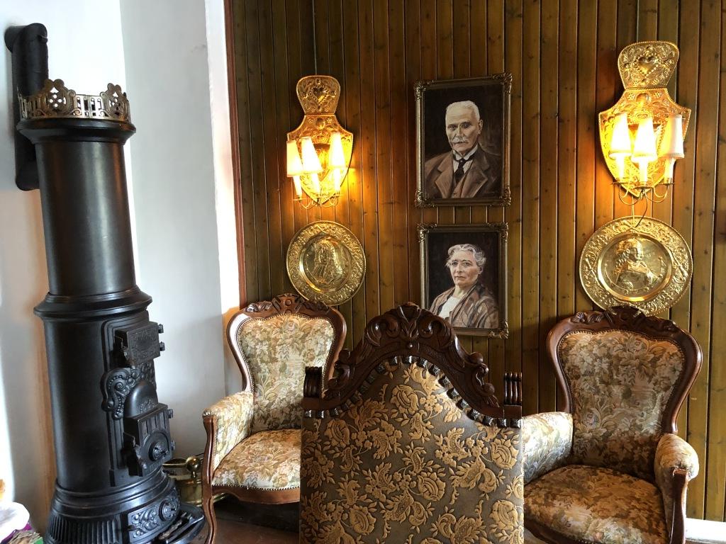 Interiør Bygdin Høifieldshotel 1: Gyldenlærsstoler og anegalleri.
