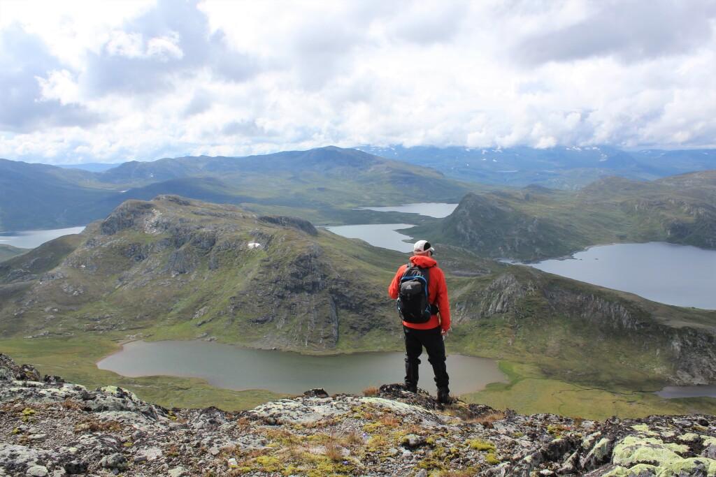 Det blåser på toppene: Vi har besteget Synshorn, 1475 moh. Det regulerte Vinstervatn-magasinet i bakgrunnen.
