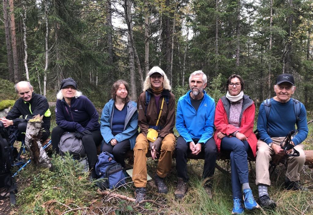 Gjengen tar pause sittende på en lang furustamme. Tiril i midten og Olav er fotograf.