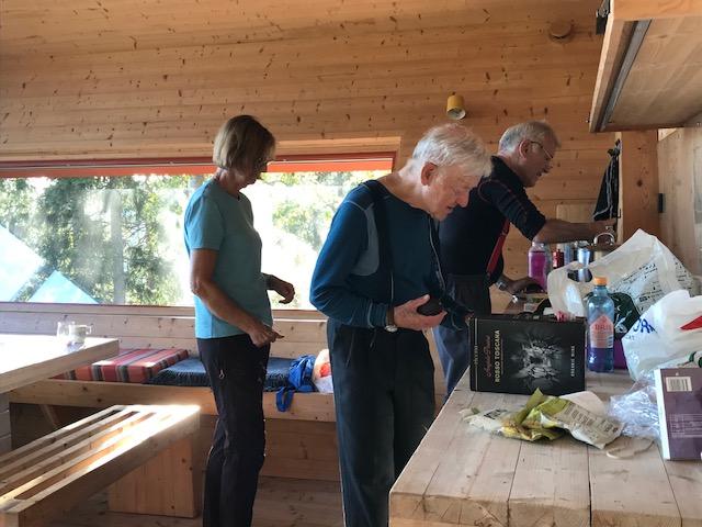 Mandag var det langsom frokost og klargjøring av hytta. Ingebjørg fulgte DNTs oppfordring om å forlate hytte i bedre stand enn da vi kom: Hun vasket gulvene så rene som de neppe hadde vært siden hytta ble bygget.