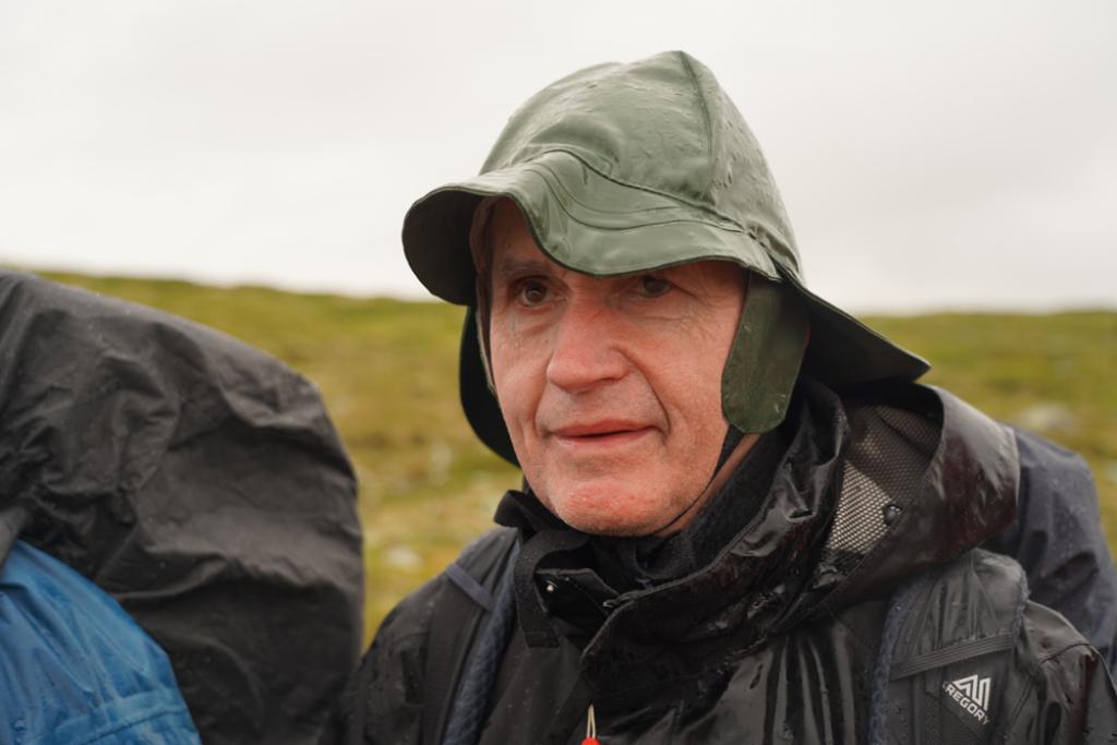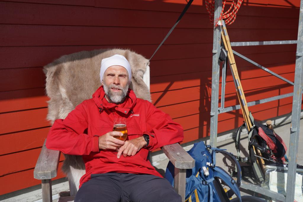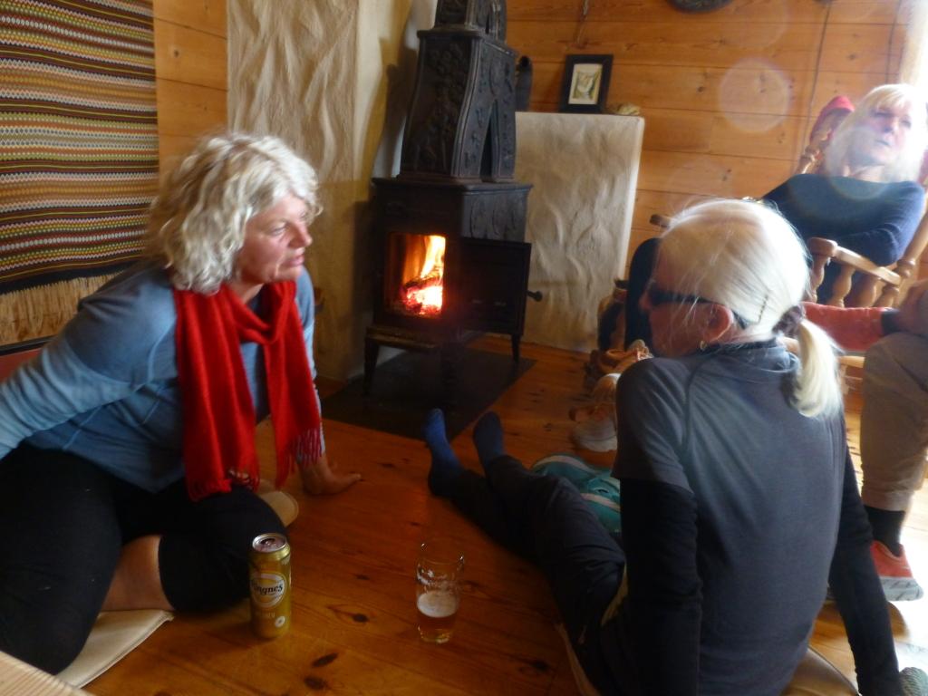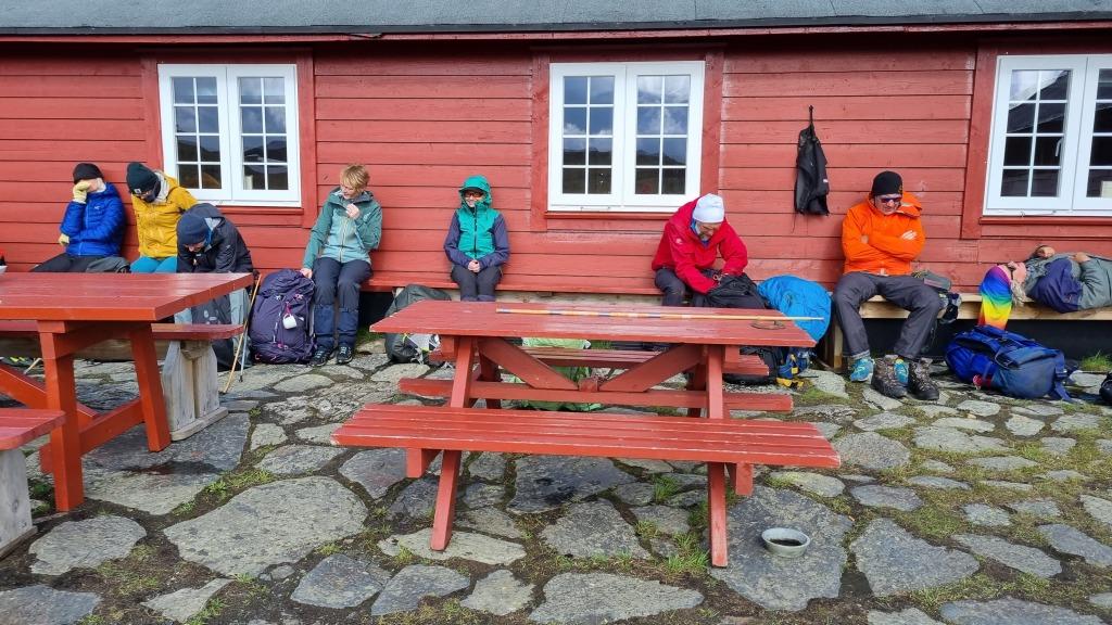Det var først ikke rom for oss i herberget: Vi venter i hytteveggen.