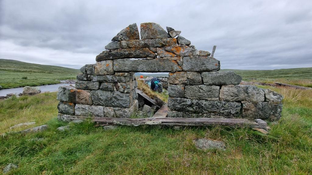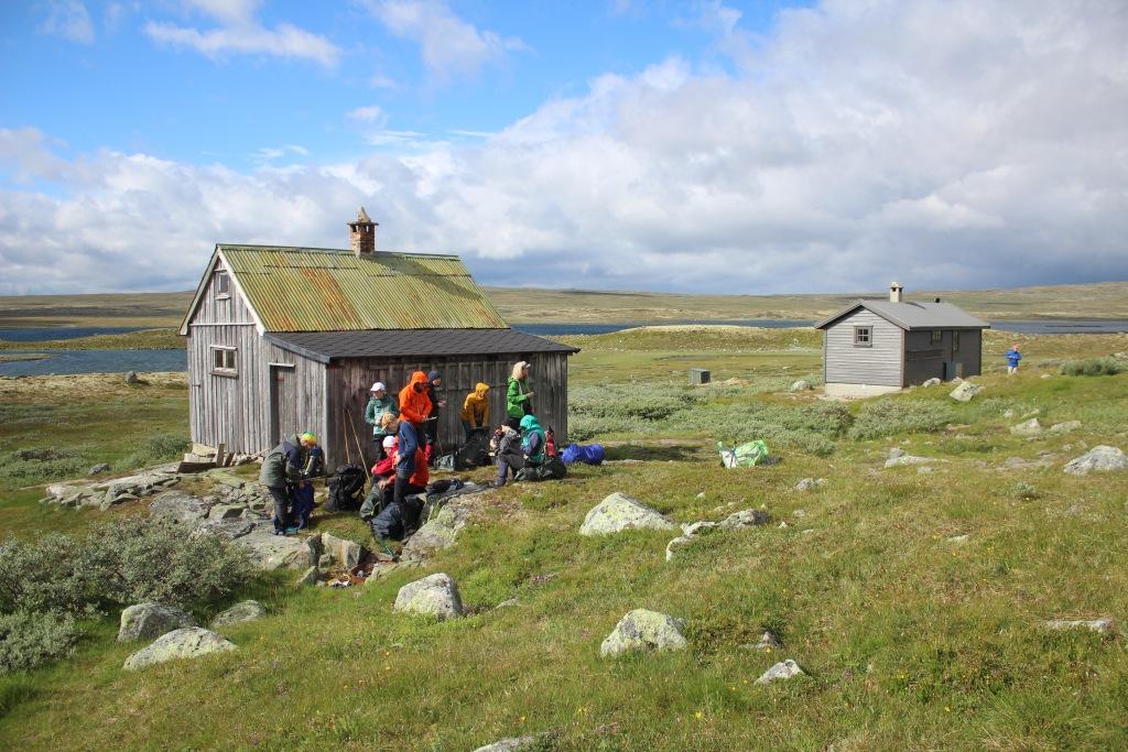 Pause og påfyll i le av seterhus ved Hellehalsen.
