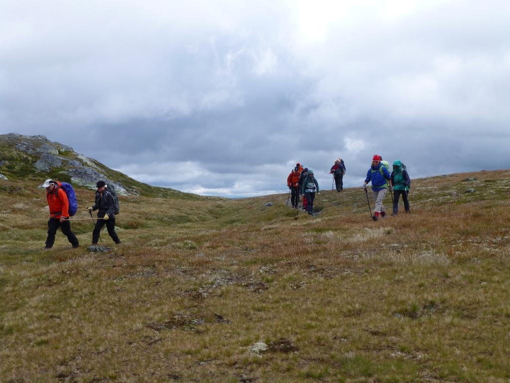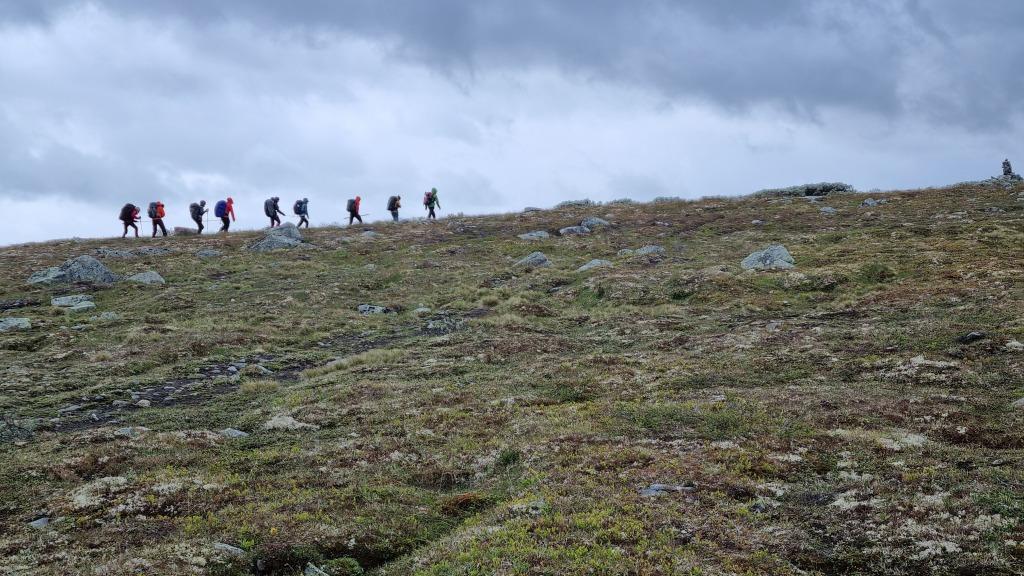 Gjengen i lettgått terreng i rekke og rad mot himmelranden.