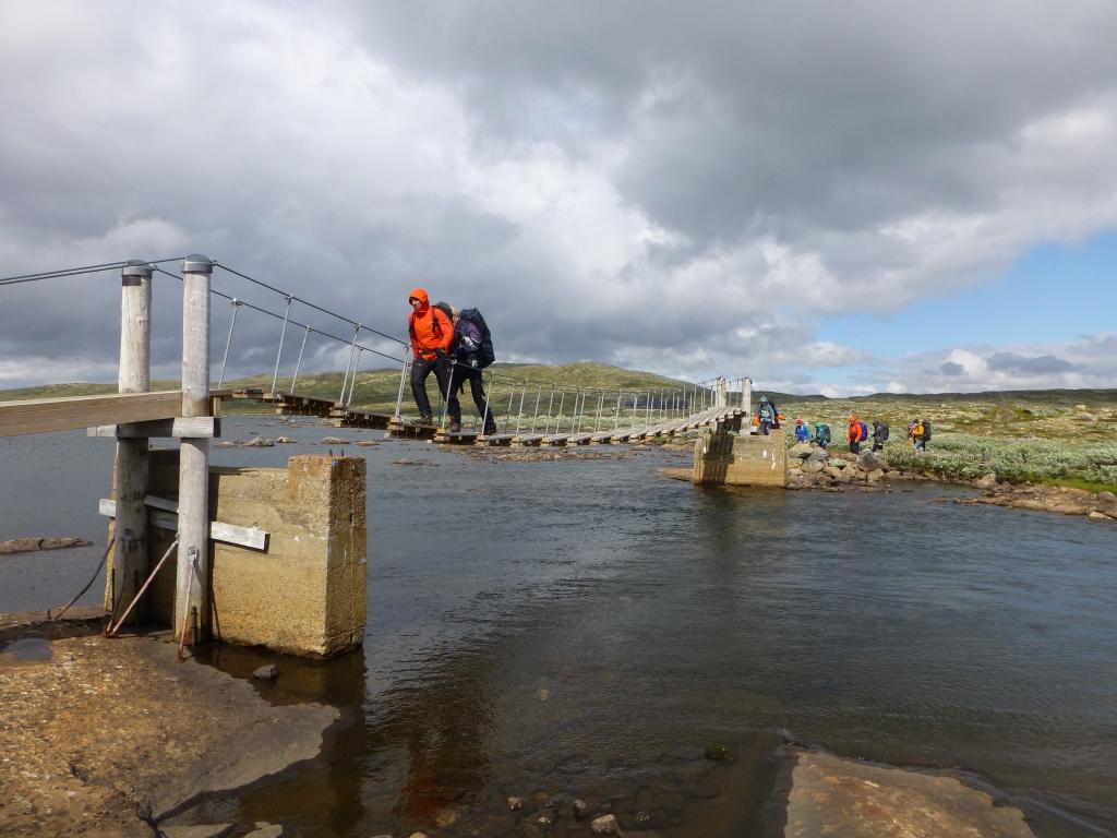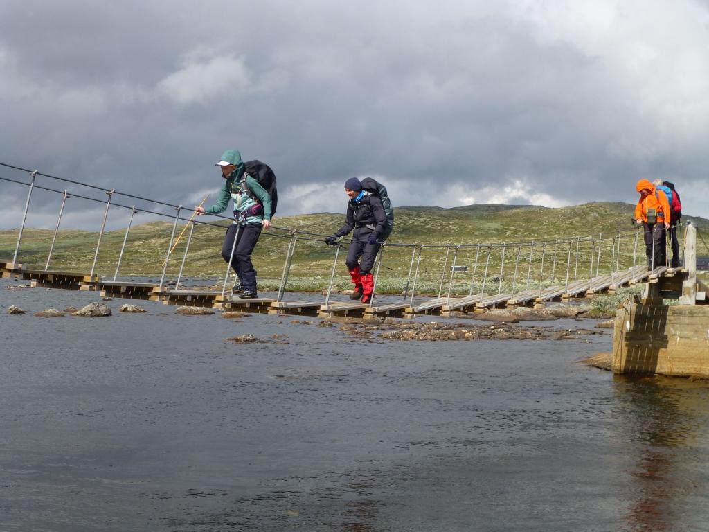 Dagens etappe var på ca. 21 km. til Besso på 1260 moh. Vi fortsatte sydover og etter hvert syd-vestover. I starten fulgte vi traktorvei og videre bred sti mot Sandhaug, som ligger midt på vidda. Der tok vi en lengre stopp med kaffe og vaffel for de som ville. Dagens høyeste punkt var på ca.1300 moh. Vi gikk en del på klopper over myrer, over bru ved Snero, gjennom Eriksbudalen, passerte Holmsbustrykene, krysset Nordmannslågen på broer. Det var små høydeforskjeller. Været var surt og kaldt, og regnbygene pisket i motvinden. På Besso hadde de gjort en feil med bookingen, og ventet oss derfor et døgn senere. Det så kritisk ut for oss, men det ordnet seg ved at verten med frue og noen fiskere flyttet ut av sine rom, og gode ekstrasenger ble satt inn. Vi fikk nydelig middag bestående av fersk fjellaure. Stemningen ble god!