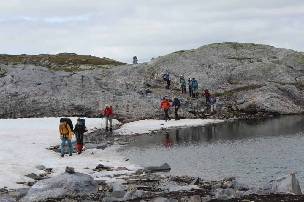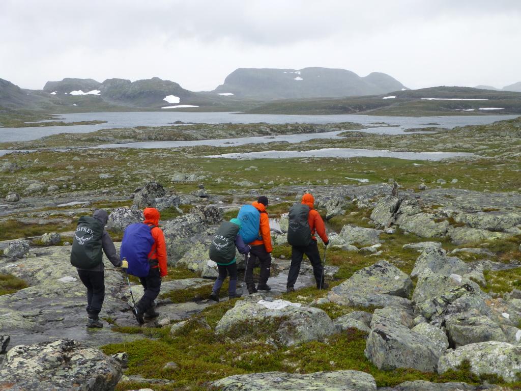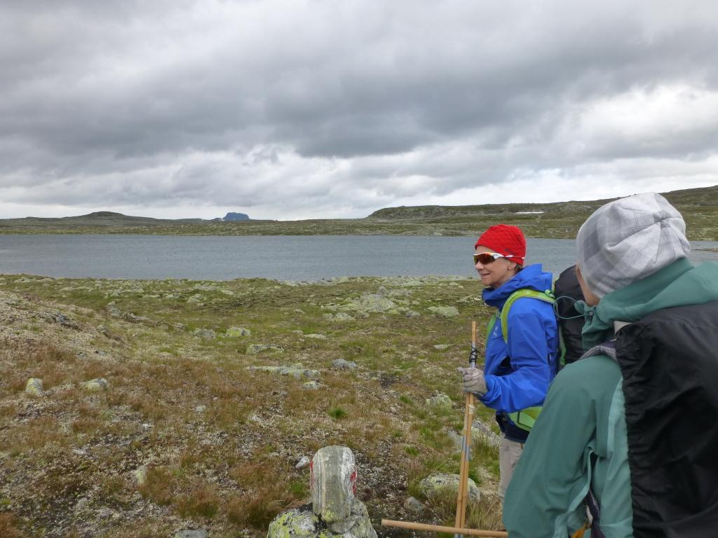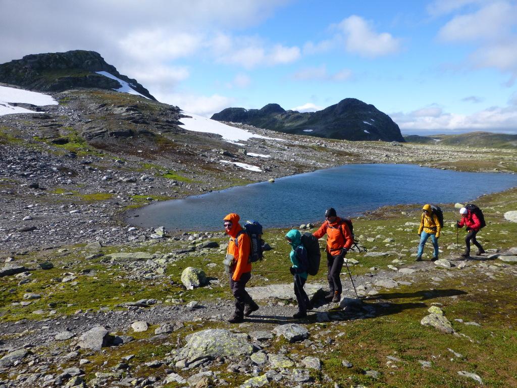 På flatene mot Ambjørgsvatnet med tre oransjekledde ledsagere.