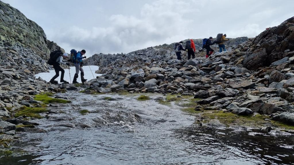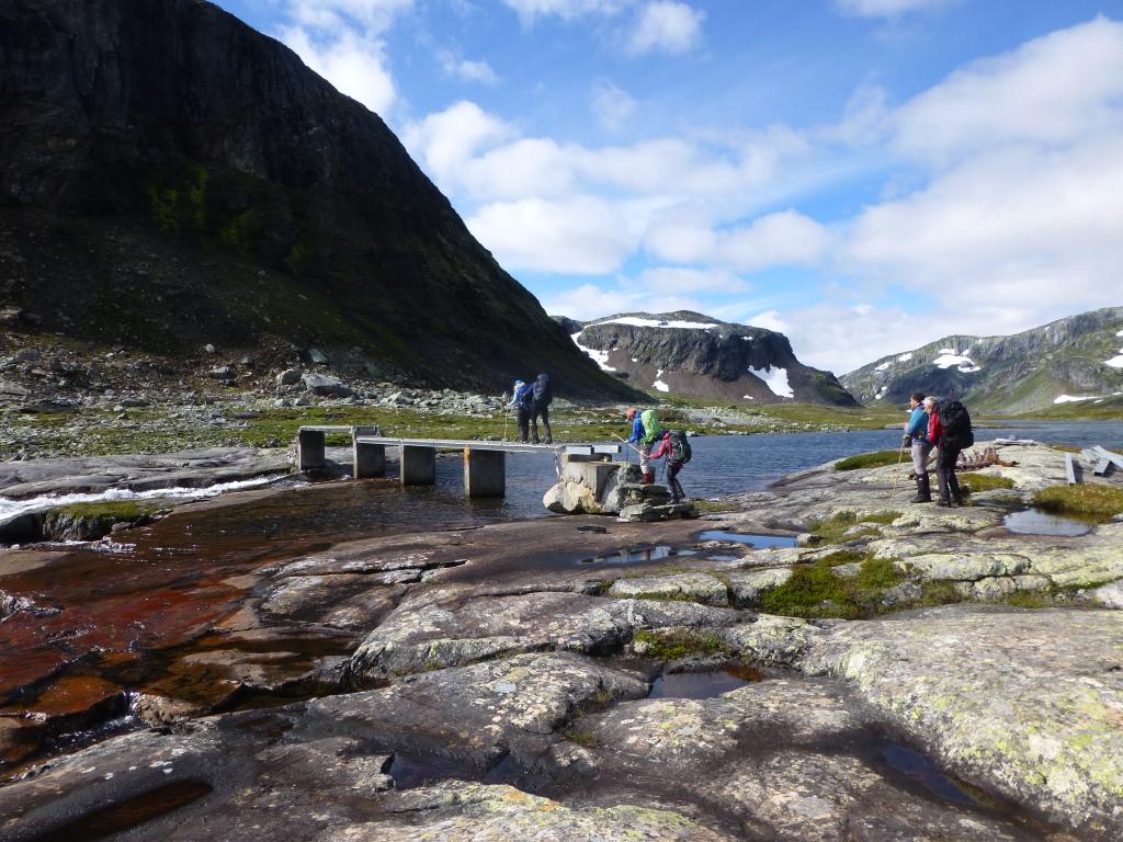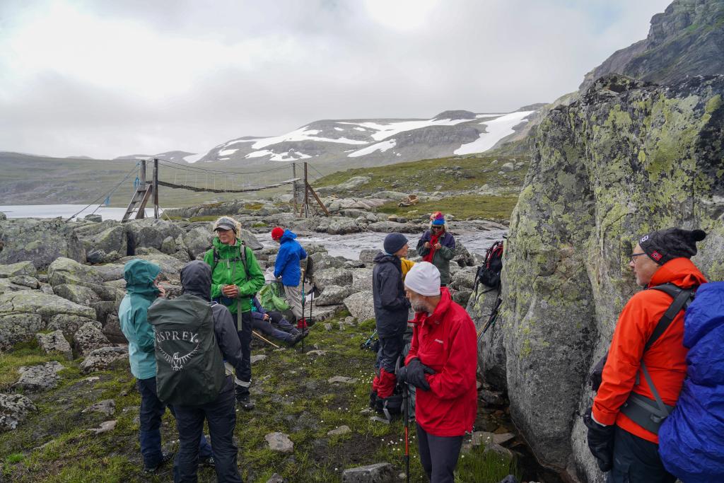 Vi søker ly for vinden ved noen kampesteiner før kryssing av bru ved Simletindvatnet.