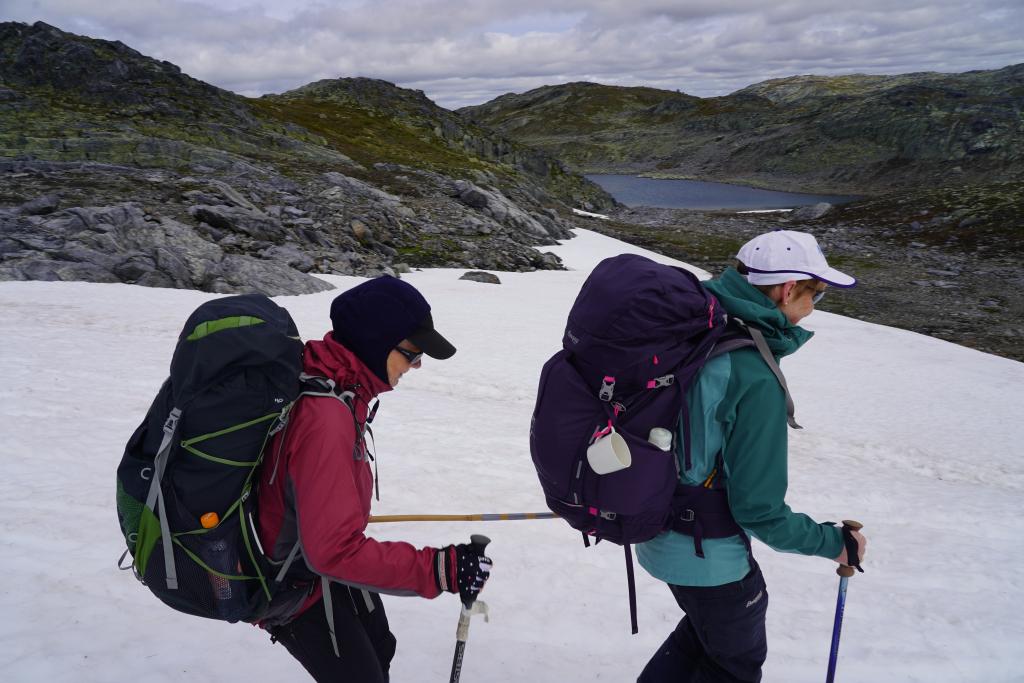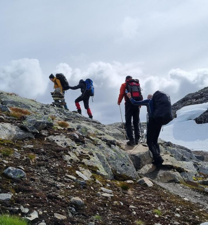 Vi går «i sekk» opp ei bratte. Fotograf: Ingalill Bartlett.