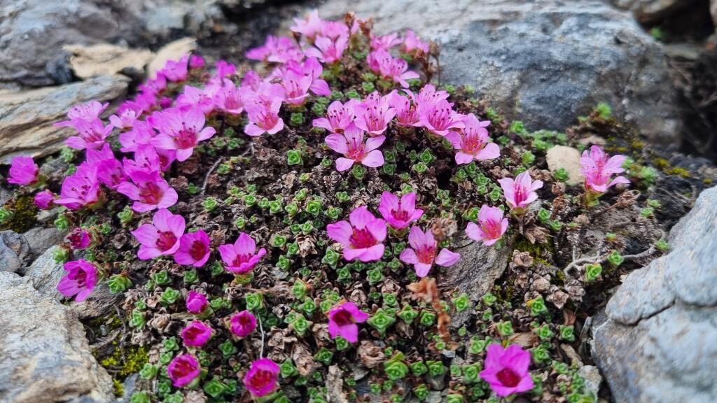 Blomst: Rødsildre-blomster i kompakt tueformasjon.