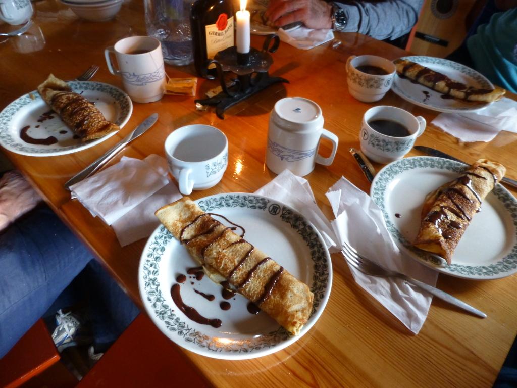 Inne i varmen på Hellevassbu: Knuts spesial, Crêpes Suzette, til dessert.