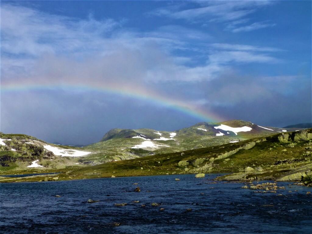 På vei mot Haukeliseter: Tilbakeblikk med flott regnbue over Øvre Hellevatn.