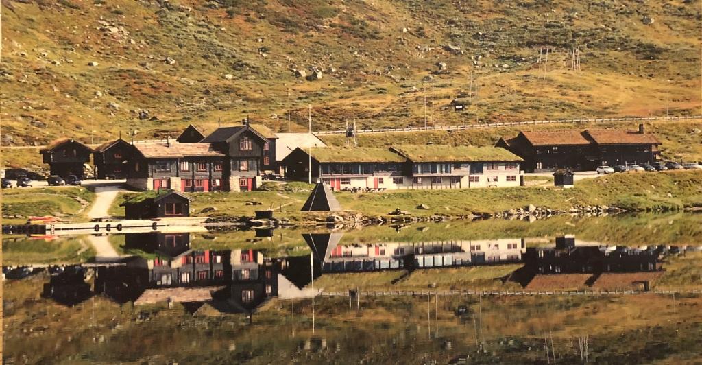 Haukeliseter Fjellstue speiler seg i Ståvatn (postkort).
