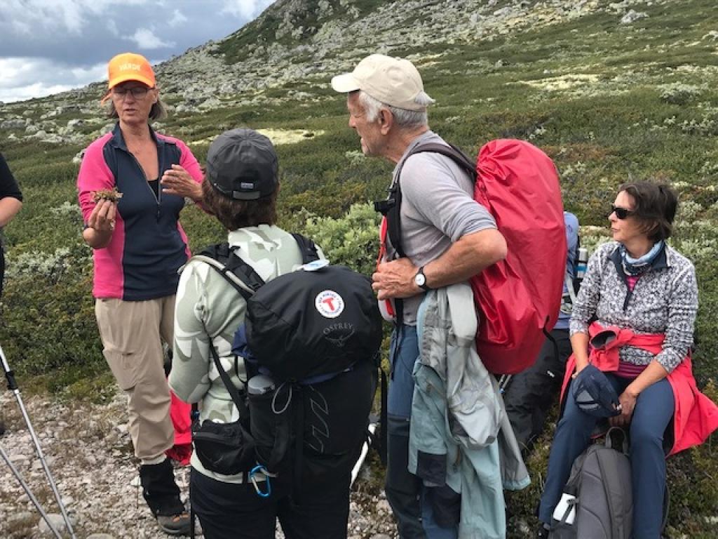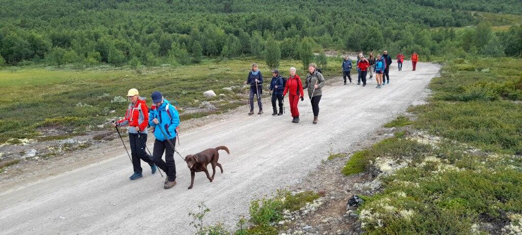 Vi gikk i retning sør mot Imingfjell Turistheim. Fulgte Store Nordmannsslepa/DNTsti. Yr var ikke på vår side, så vi snudde etter ca 4 km. Samme vei tilbake. Noen fikk kjenne på kroppen hvor viktig det er å ha ulltrøye innerst, ekstra klær i sekken, regntøy (jakke OG bukse), vanntette tursko/gamasjer, lett tilgjengelig energimat og varmt drikke. Det ble god tid til en samling før middag hvor Bente botaniserte litt mer, gjennomgikk litt 1.hjelp og generelt hva som bør være med i sekken.