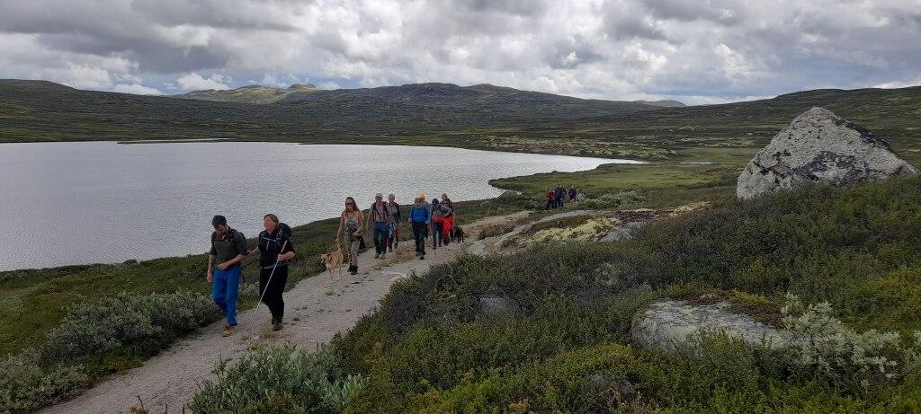Vi fulgte igjen Store Nordmannsslepa, denne dagen mot nord og Dyregravshallie/Rauhelleren. Vi tok en liten avstikker og så på restene av 2 dyregraver. Yr meldte torden og lyn, så etter en real regnskur og lunsj snudde vi like før nasjonalparkgrensen. Vi hørte bulder og brak i retning Hallingskarvet, men uværet kom heldigvis aldri over oss. Litt botanisering på veien hjem av Bente. Samme vei tilbake. Fin tur på 7,5 km. Vi fikk god tid før middag, og vi ble oppfordret til en ettermiddagstur i det fine ettermiddagsværet. Noen gikk da opp langs Krukeåe på en fin grusvei. Turleder Bente ville sjekke ut en sti mot Krukenuten sammen med Dag og Ingebjørg. Den ble vurdert som ikke egnet for gruppa. De som gikk ettermiddagstur kan plusse på 3 km.