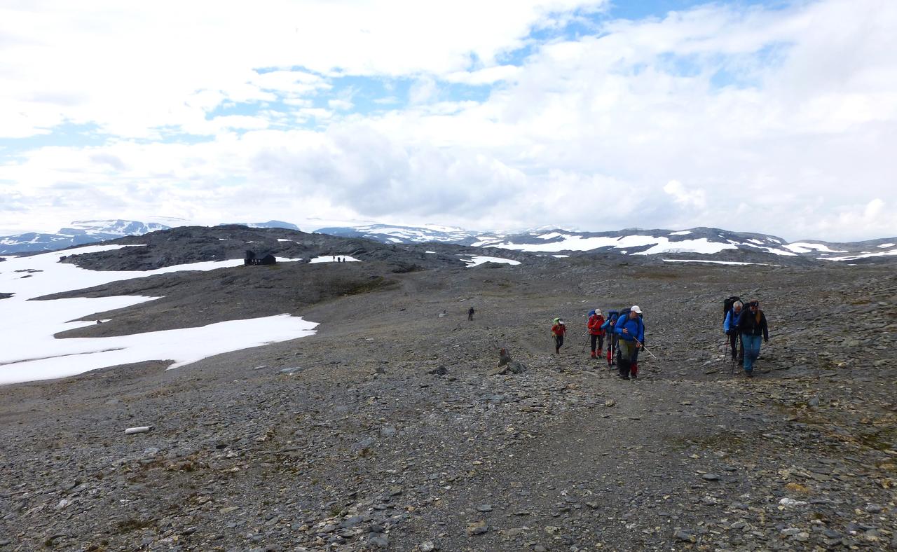Fotturen er i gang: Gjengen med Hardangerjøkulen i sør. Foto: Ingalill Bartlett.