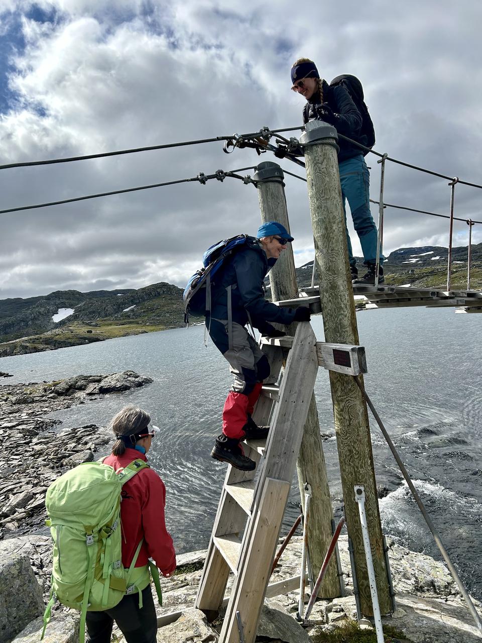 Onsdag: Dagstur fra Geiterygghytta/1224 østover i retning Raggsteindalen: Vi krysser Skarvåi på hengebru ved høyde 1300.