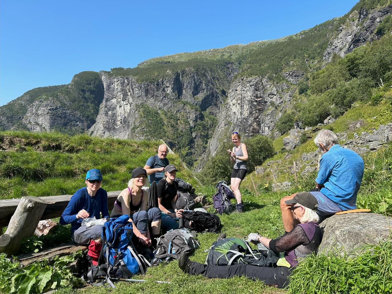 Bussen ned til Vassbygdi gikk dessverre ganske sent, så vi kom ikke i gang med turen opp Aurlandsdalen før godt ut på formiddagen. Strekningen var på ca. 19 km med en stigning fra 80 til 820 moh. Været viste seg fortsatt fra sin aller beste side.