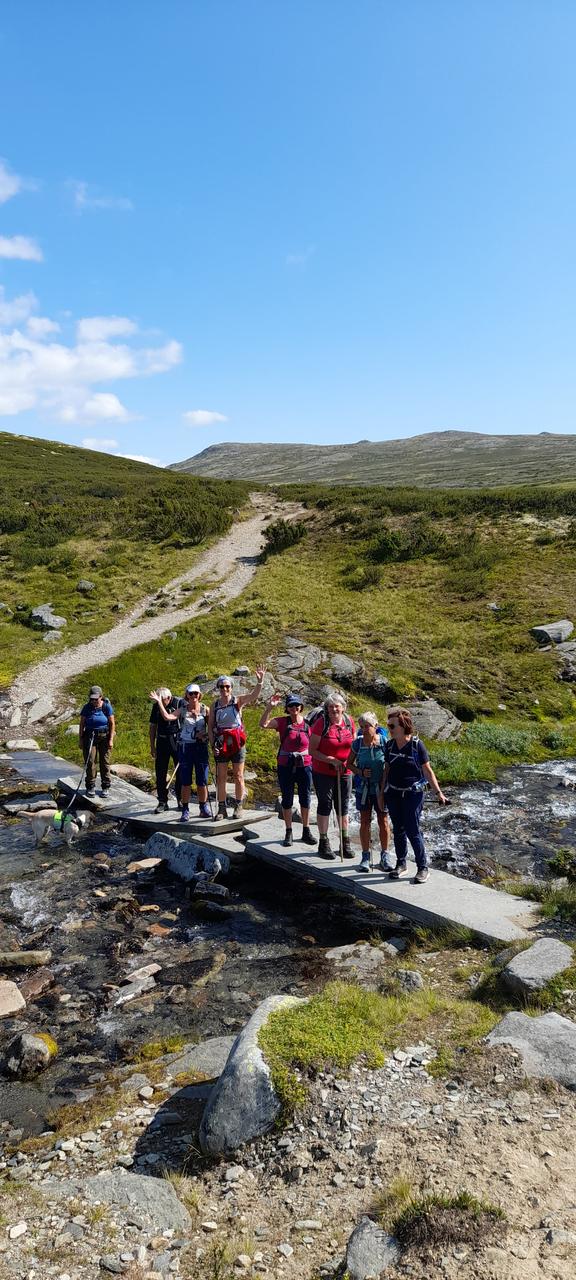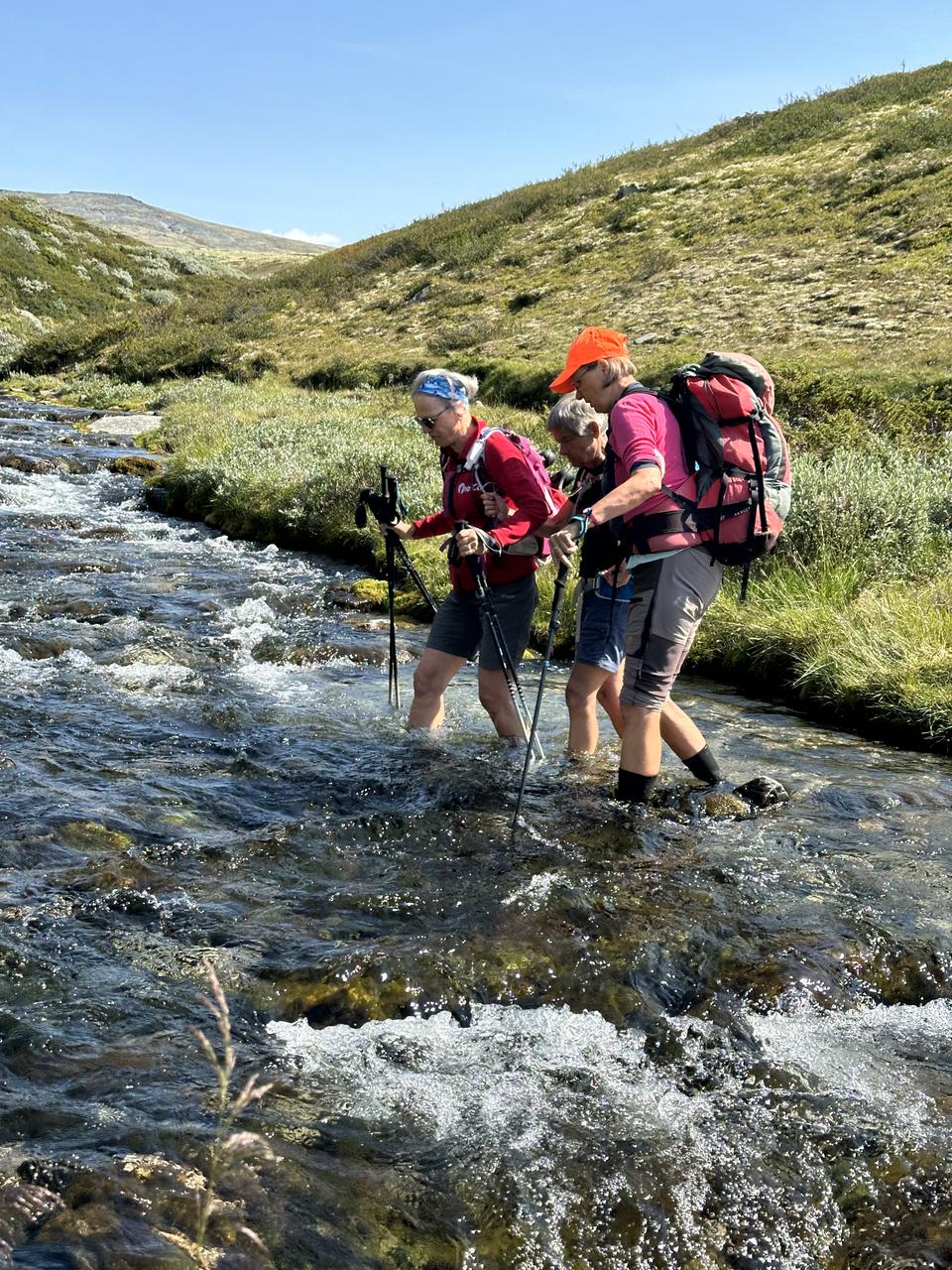 Vi fulgte DNT ruten mot Grimsdalshytta. I følge kartet skulle det være godt merket sti for å komme over Kvannslådalsåe, noe det ikke var. Turleder fant etterhvert en måte å komme ned til elva på. Matpause. Så var det av med støvler, på med ullsokker og vading arm i arm over elven. Det ble en fin og positiv erfaring for alle. Returen gikk på høydedraget på andre siden av dalen tilbake til Laurgårdseter.