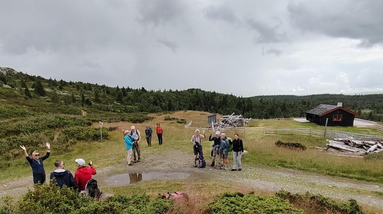 Startet på Mjølkeruta og tok av ved Ulbergsetra. Sti i bjerkeskog fram til Leikvamssetra. Noen utfordrende bekker og blautmyrer som ble forsert med glans. På grusvei til Veumsetra. Her ble vi møtt med høye stålgrinder og skigarder som vi måtte klatre over. Dette p.g.a beitende storfe i området. Videre på sti til Hovesetra og deretter Mjølkeruta tilbake til Fagerhøy.